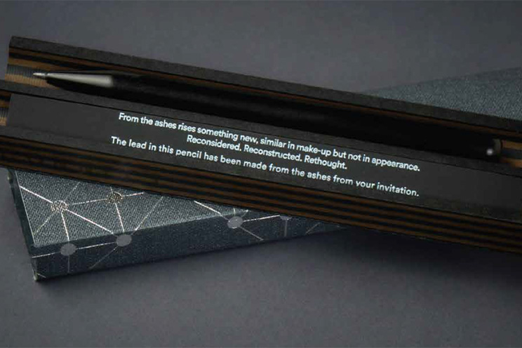 We designed a direct campaign centered around the theme of Evolution. Recipients received a box handmade from Richlite, a sustainable material made from recycled paper and resin. Inside were invitation cards, which recipients were asked to burn and send the ashes back in a provided envelope. These ashes were used to create pencil lead, and each recipient received their burnt invitation back, now evolved into a pencil. This process built anticipation and allowed recipients to participate in the theme of evolution.